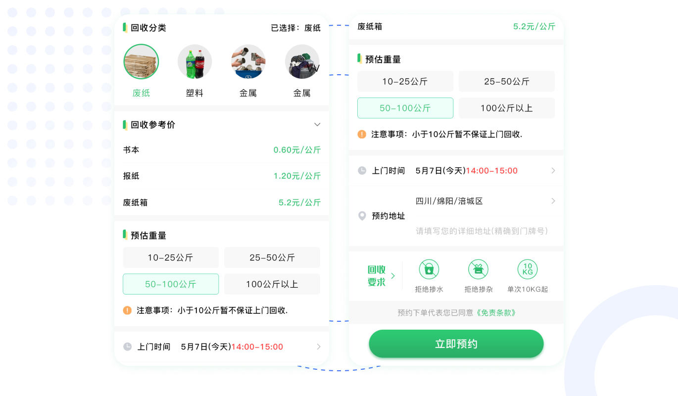 用戶(hù)一鍵下單回收,系統(tǒng)自動(dòng)派單,回收員上門(mén)回收