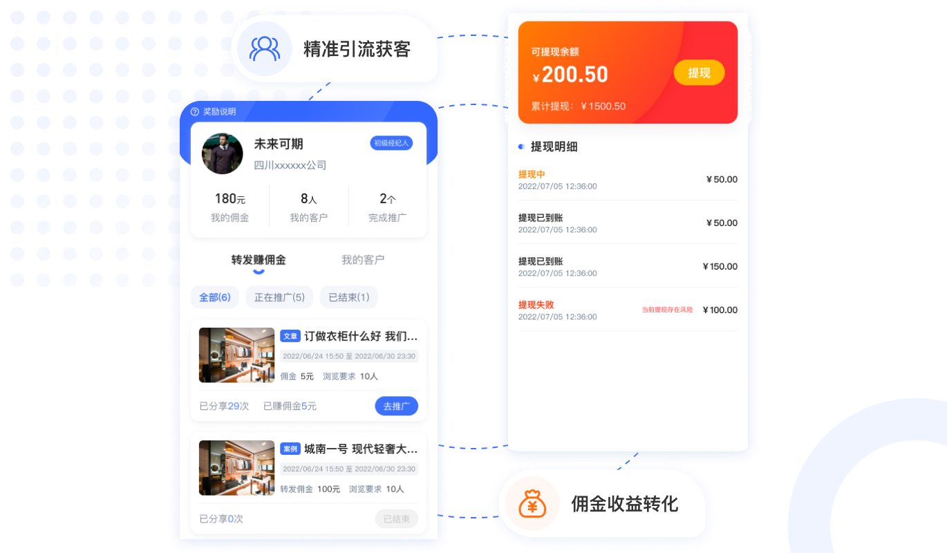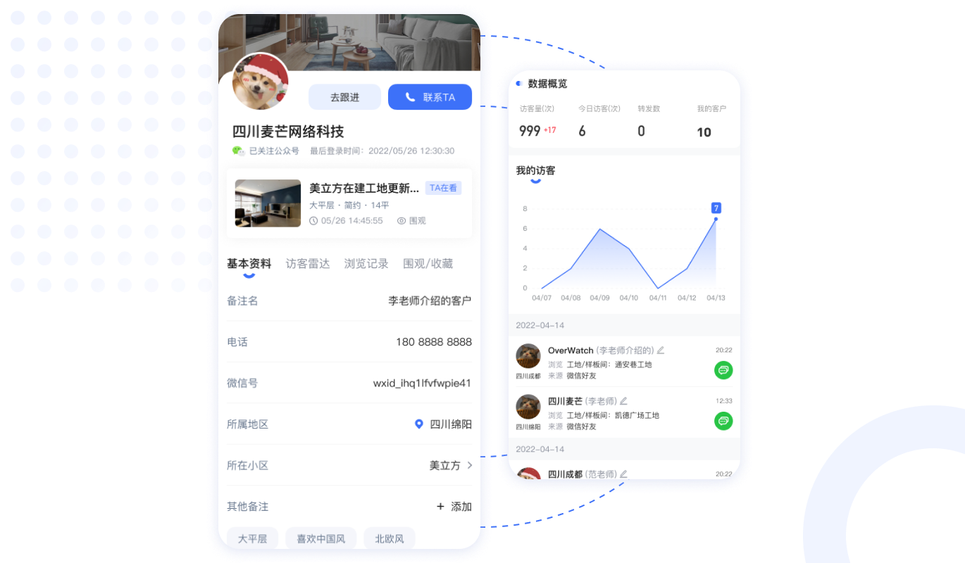 精準(zhǔn)引流,客戶(hù)軌跡追蹤推送、深度洞察客戶(hù)需求。 快速鎖客,直接對(duì)話(huà)消息及時(shí)提醒,增加量房量為銷(xiāo)售賦能。