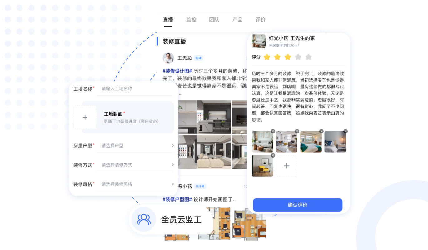 工地實(shí)時(shí)監(jiān)控直播,業(yè)主足不出戶(hù),實(shí)時(shí)觀看裝修現(xiàn)場(chǎng),工地圖文,視頻,VR全景實(shí)時(shí)更新,保證裝修進(jìn)度。